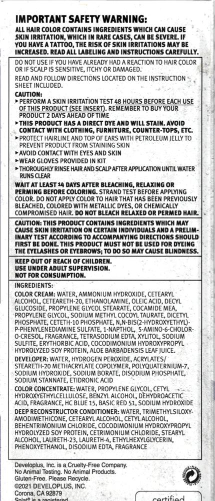 Prepare to turn heads! Take your dark tresses to bold in a single step with double the lifting power of traditional color. Splat permanent hair color delivers vibrant root-to-tip color in one transforming step. An easy to apply cream formula that lifts and deposits bold color, eliminating the need for bleach. Cream formula contains Aloe Vera and Soy Protein.