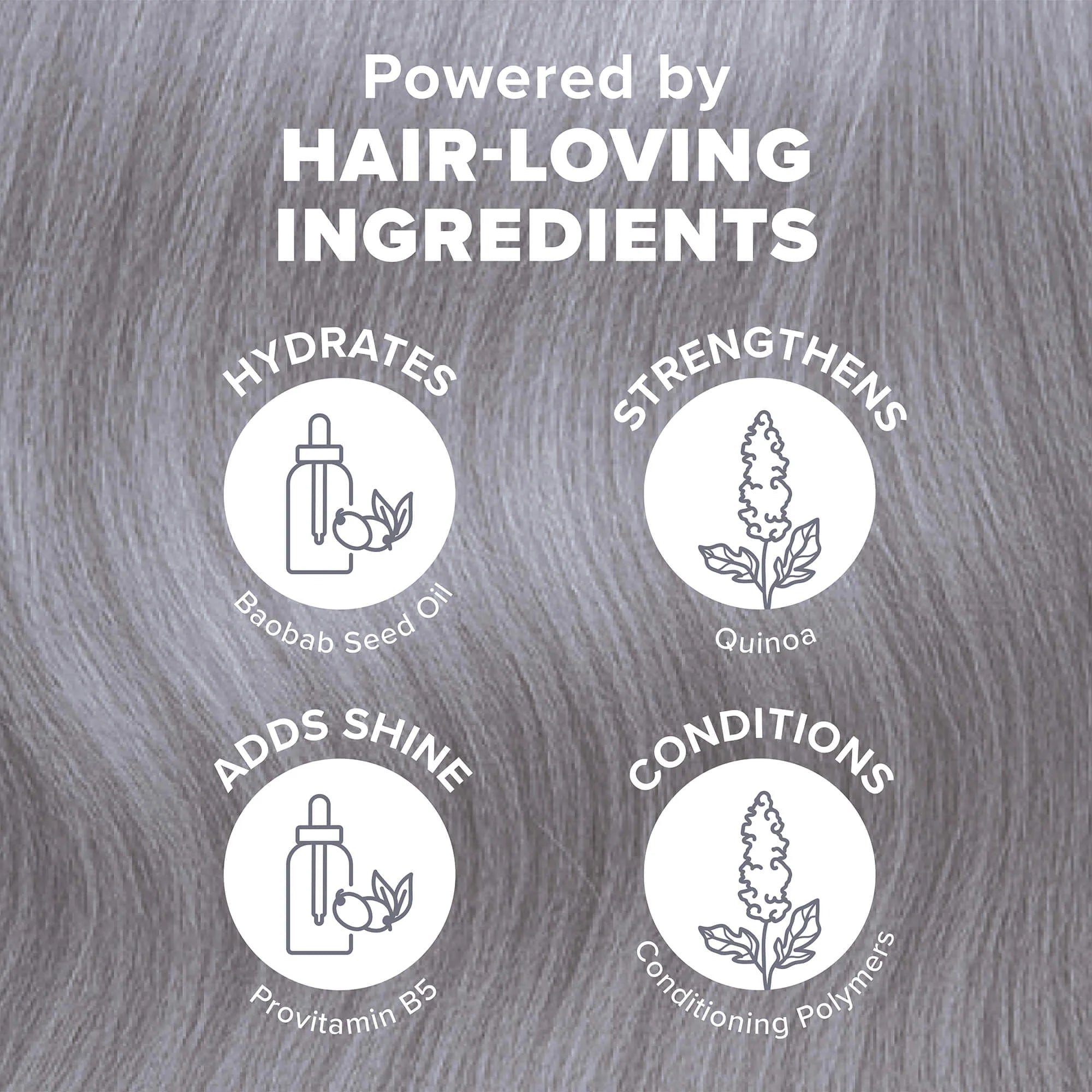 Water, benzyl alcohol, propylene glycol, polyquaternium-37, propylene glycol dicaprylate/dicaprate, hydrolyzed adansonia digitata seed extract, hydrolyzed quinoa, disodium EDTA, panthenol, phenoxyethanol, ethylhexylglycerin, citric acid, trideceth-6, cocamidopropyl betaine, basic violet 3*, Ext. D&C violet 2, fragrance.
